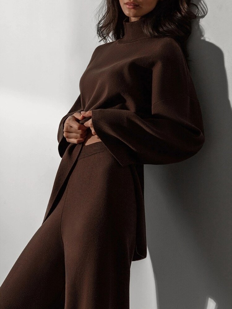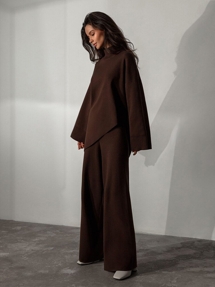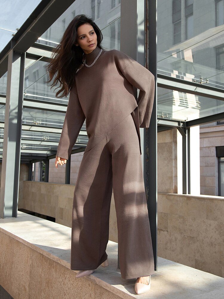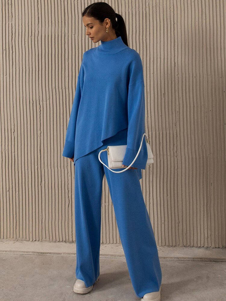ملابس من قطعتين بنطلون فضفاض وبلوزه هاينك بقصه مائله بدلات نسائيه شتويه موضه جديده جديد ملابس ترند